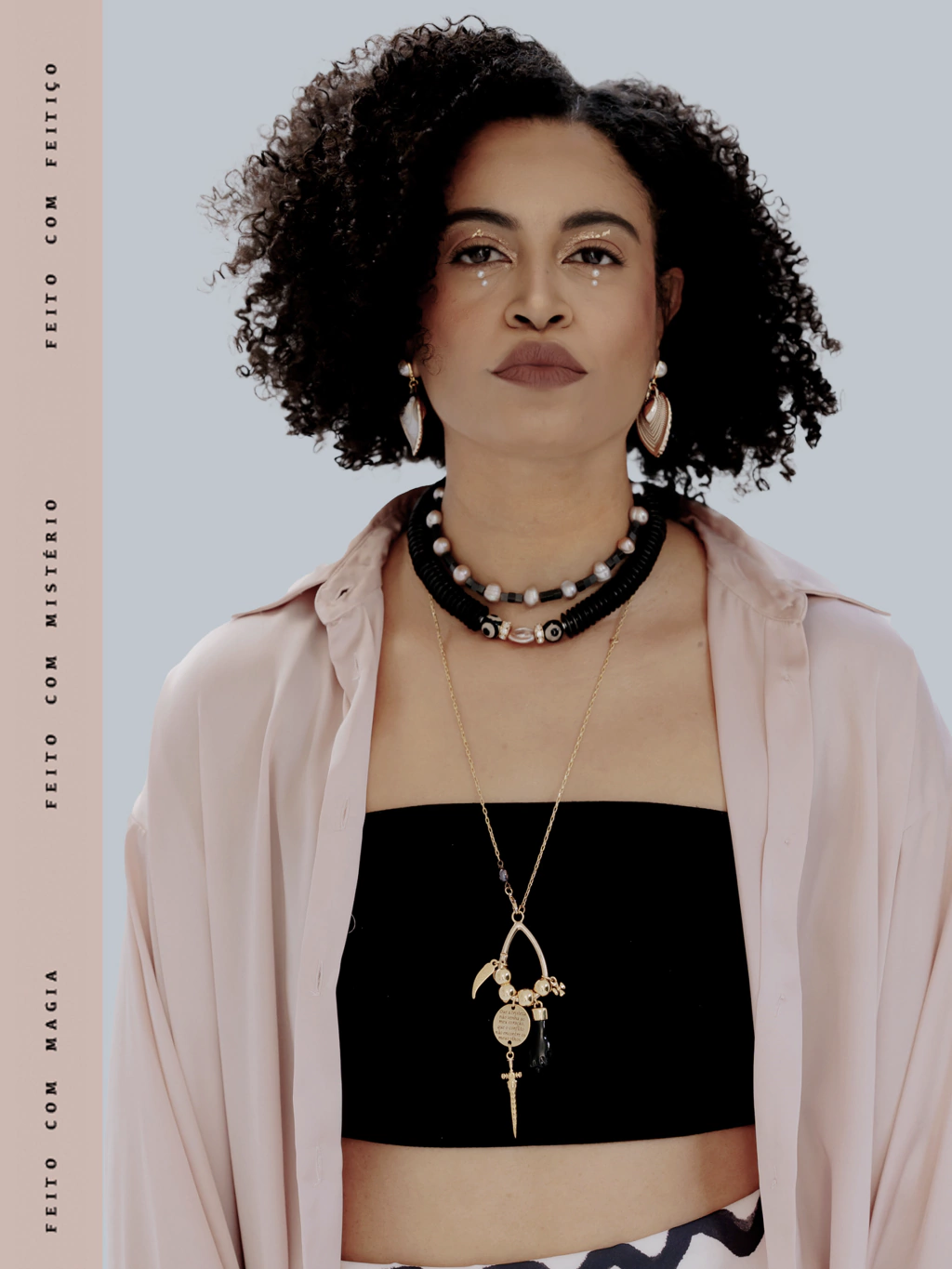 As peças da coleção (gargantilhas, pulseiras, brincos e colares-talismãs) foram criadas para serem usadas sozinhas ou em camadas, compondo narrativas visuais que intensificam a sensação de beleza e poder a cada nova adição.